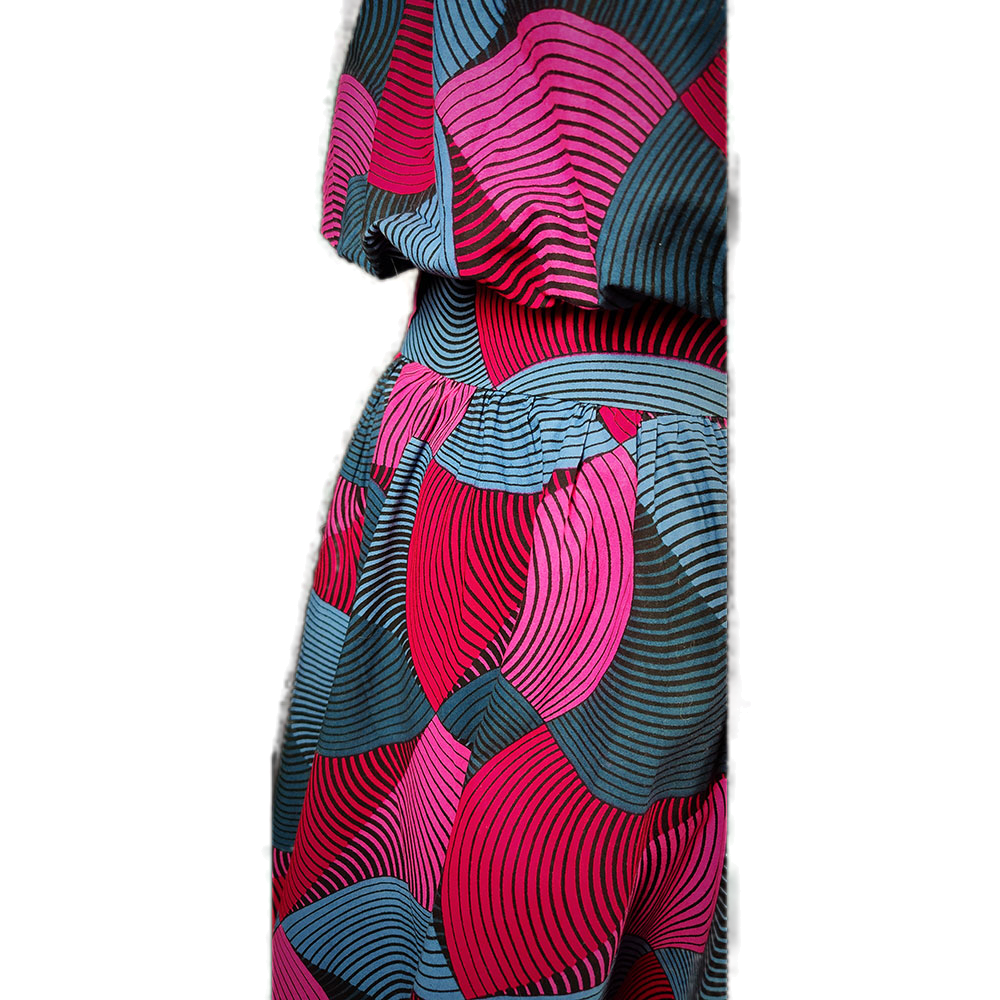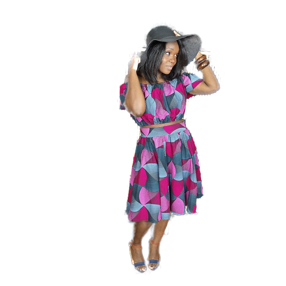 Sentez-vous sur le toit du monde grâce à cet ensemble audacieux, conçu pour faire ressortir votre féminité. Élastique sur le haut et le bas du top, jupe avec zip sur le côté. Création en tissu Wax, 100% fait main.